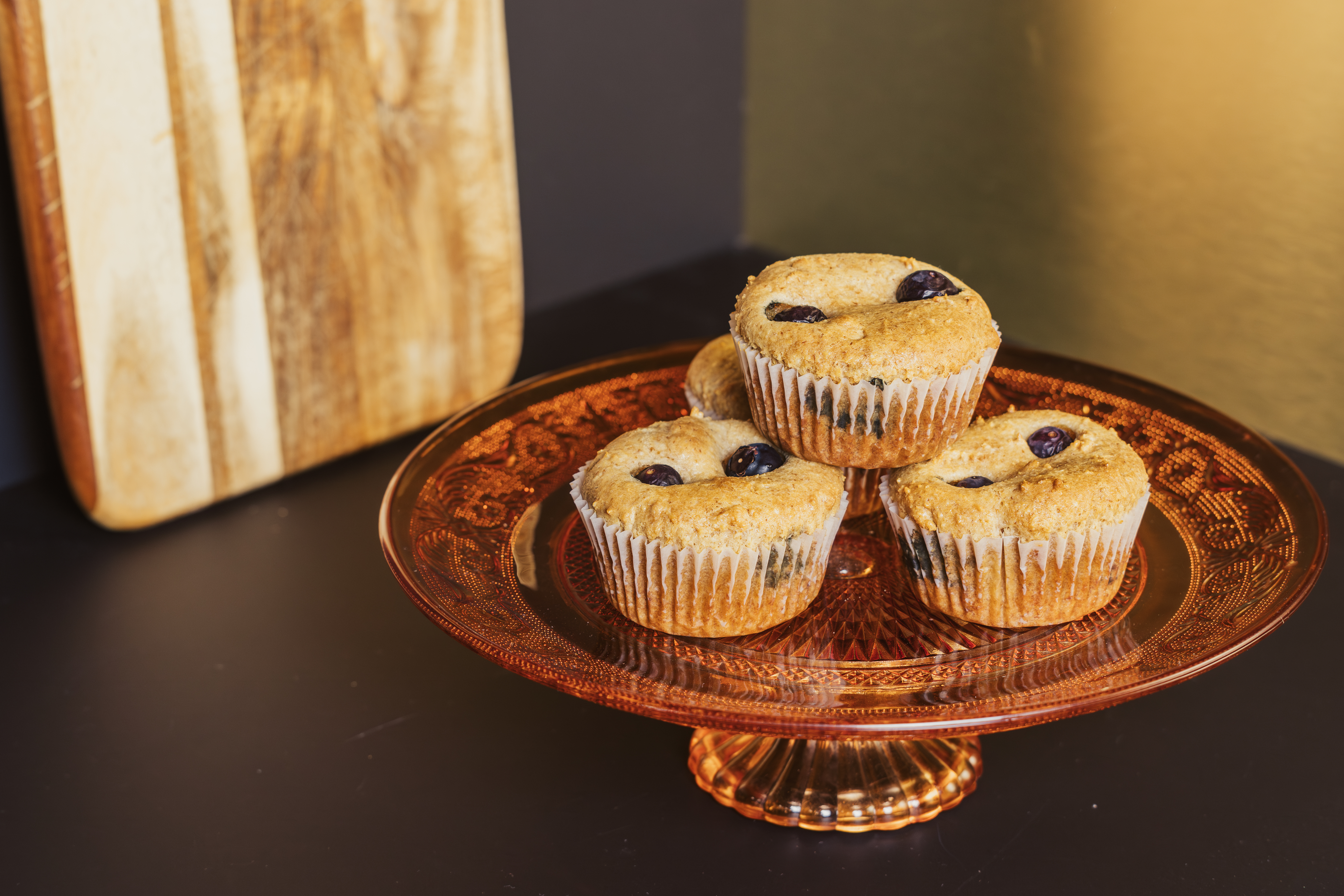 Verdeel het beslag gelijkmatig over 4 ingevette muffinvormpjes en druk de blauwe bessen erin. Bewaar er één voor bovenop elke muffin te leggen.